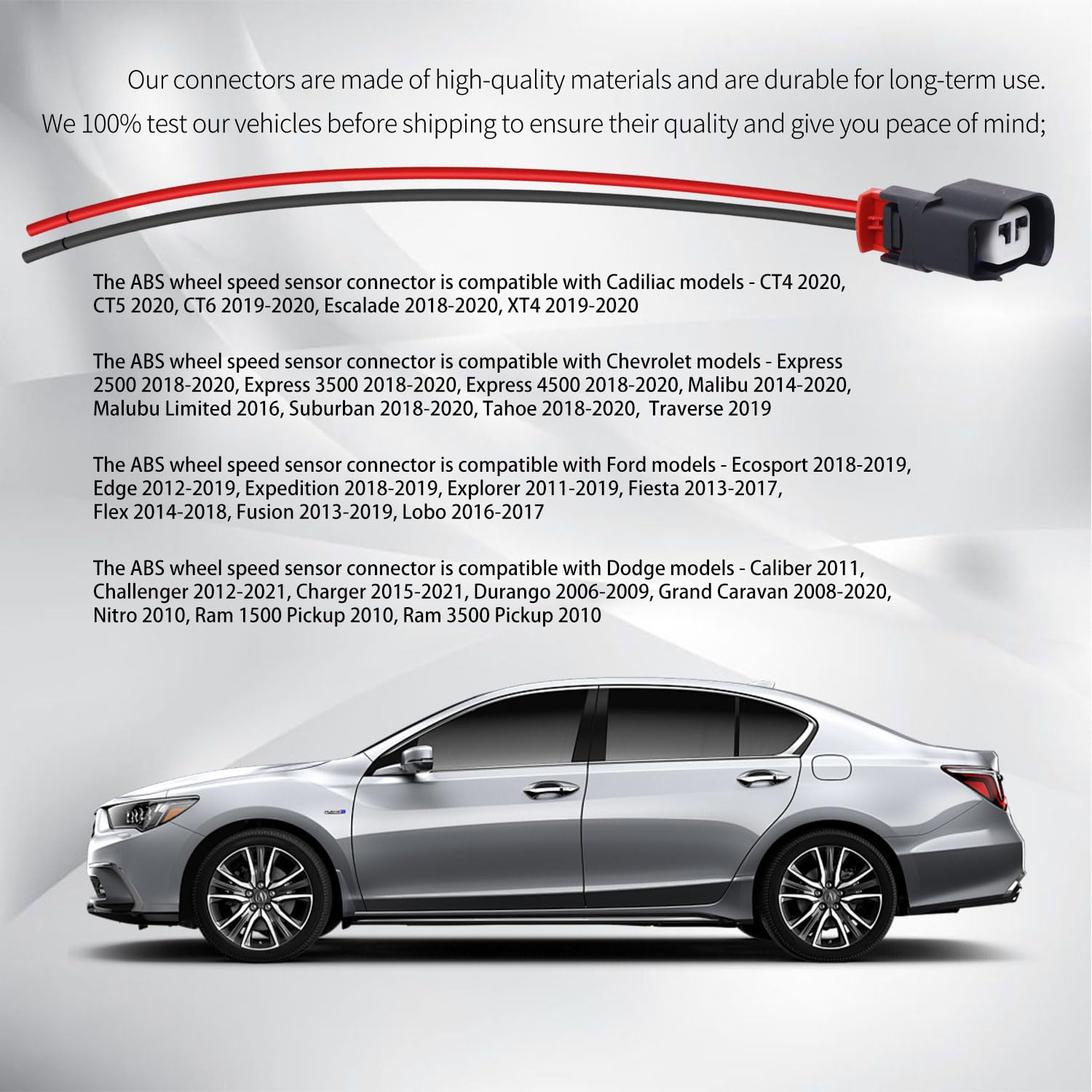 - FITMENT-1: The ABS wheel speed sensor connector is compatible with Cadiliac models - CT4 2020, CT5 2020, CT6 2019-2020, Escalade 2018-2020, XT4 2019-2020