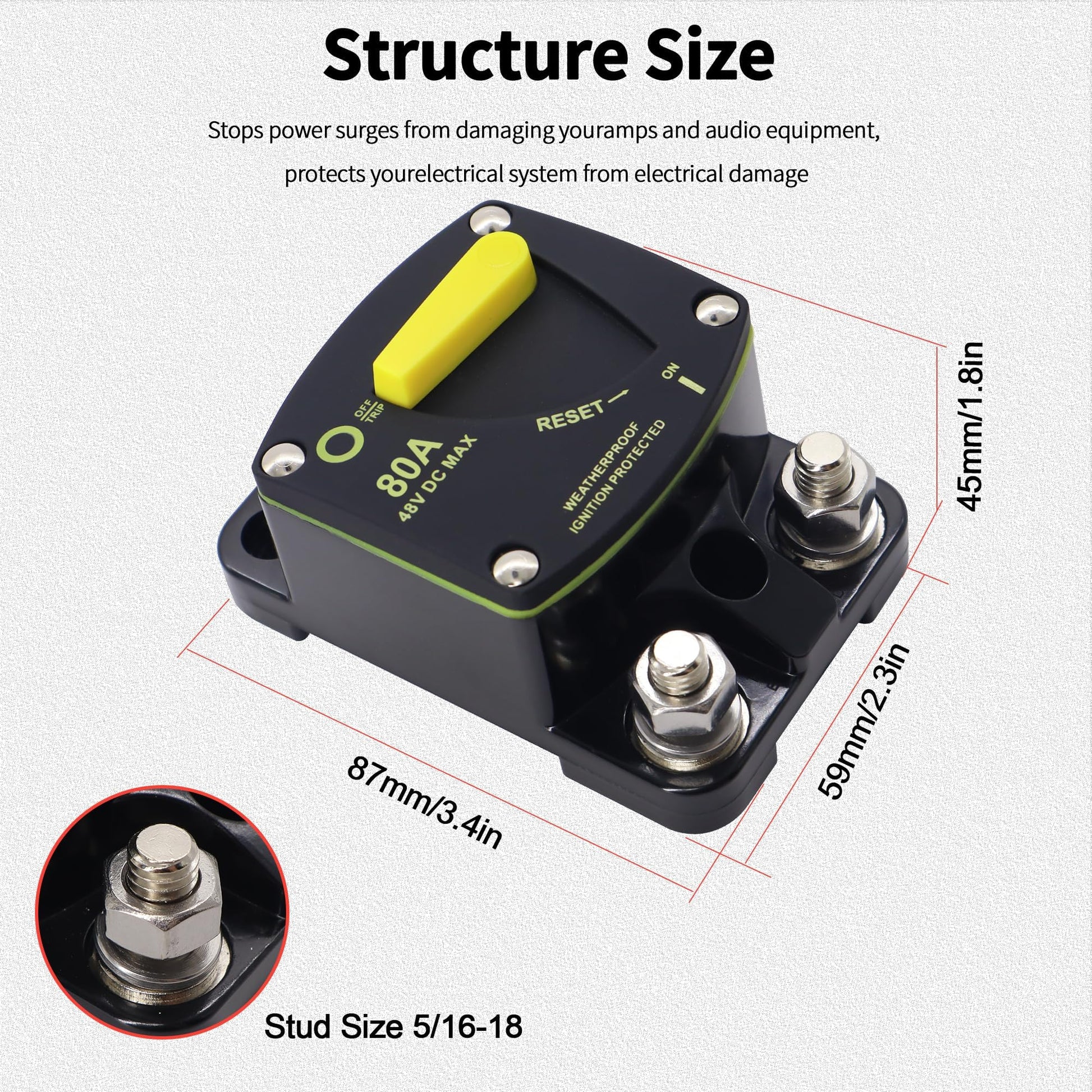 - Comprehensive Protection: The 80 Amp circuit breaker safeguards your equipment from electrical damage by preventing excessive current and stopping power surges. Suitable for a wide range of DC system voltages (12V-48V), it ensures reliable operation in high-power situations, short circuits, and equipment faults.