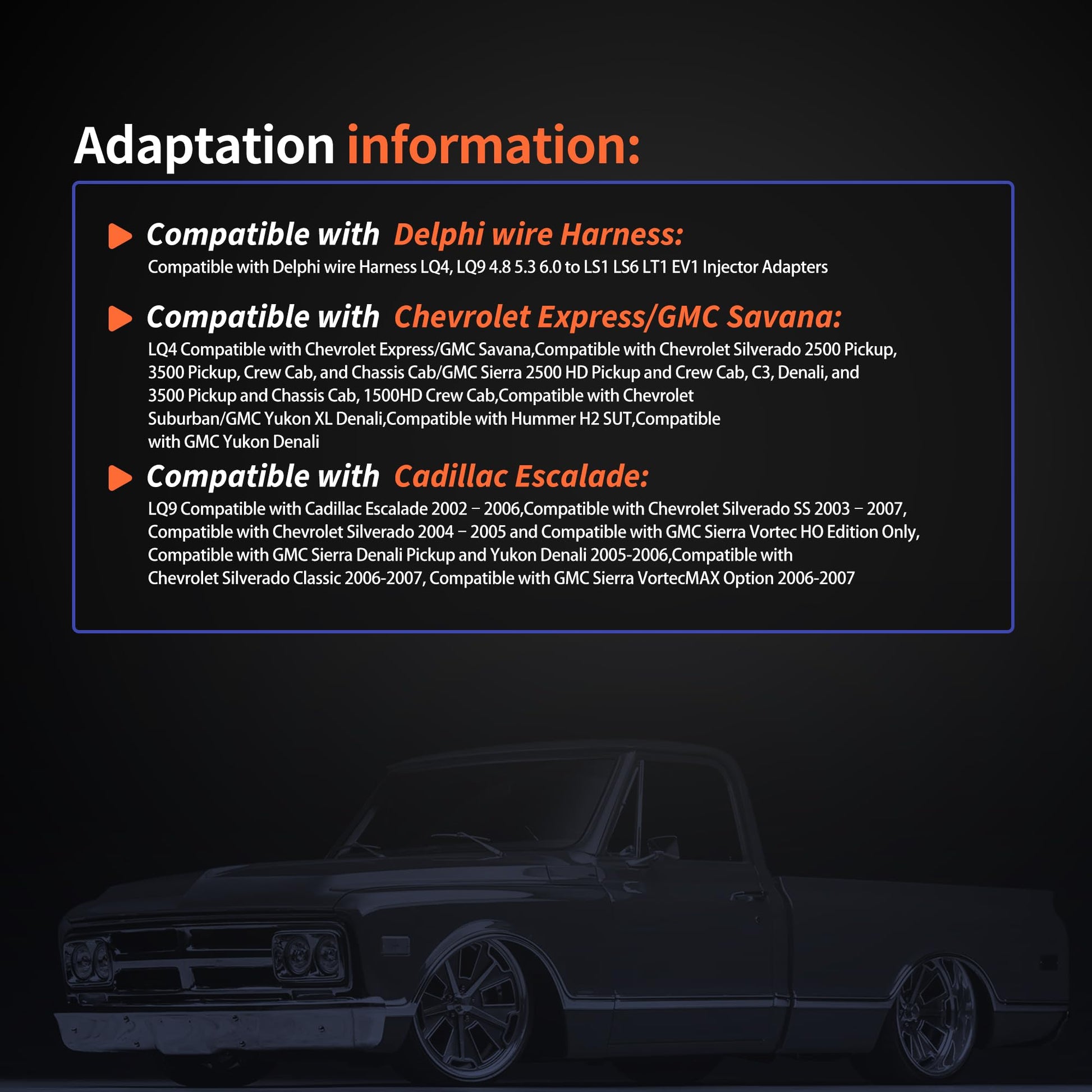 - FITMENT:LQ9 Compatible with Cadillac Escalade 2002¨C2006,Compatible with Chevrolet Silverado SS 2003¨C2007,Compatible with Chevrolet Silverado 2004¨C2005 and Compatible with GMC Sierra Vortec HO Edition Only,Compatible with GMC Sierra Denali Pickup and Yukon Denali 2005-2006,Compatible with Chevrolet Silverado Classic 2006-2007, Compatible with GMC Sierra VortecMAX Option 2006-2007