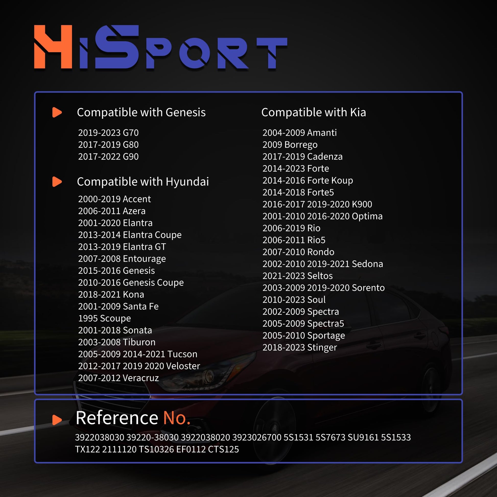 - FITMENT-1: Compatible with Genesis 2019-2023 G70, 2017-2019 G80, 2017-2022 G90; Compatible with Hyundai 2000-2019 Accent, 2006-2011 Azera, 2001-2020 Elantra, 2013-2014 Elantra Coupe, 2013-2019 Elantra GT, 2007-2008 Entourage, 2015-2016 Genesis, 2010-2016 Genesis Coupe, 2018-2021 Kona, 2001-2009 Santa Fe, 1995 Scoupe, 2001-2018 Sonata, 2003-2008 Tiburon