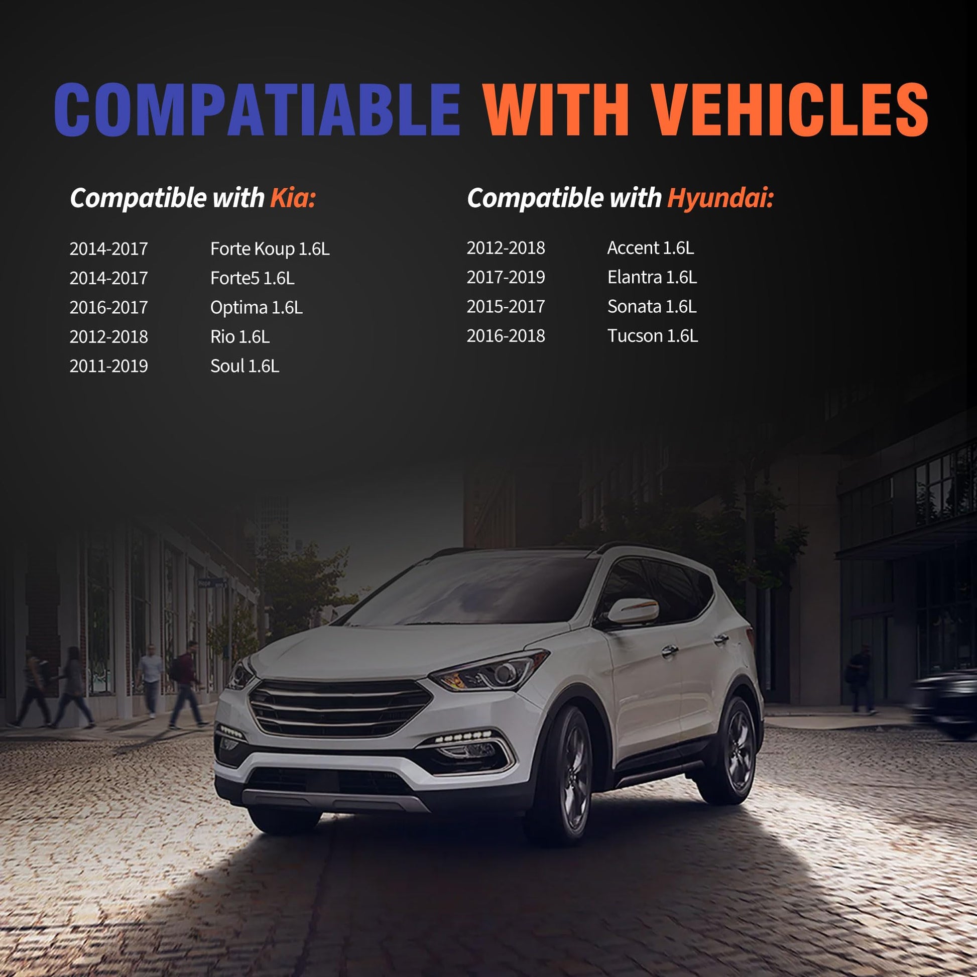 - [Applicability]The part compatible with Hyundai 2012-2018 Accent 1.6L 2017-2019 Elantra 1.6L 2015-2017 Sonata 1.6L 2016-2018 Tucson 1.6L . Compatible with Kia 2014-2017 Forte Koup 1.6L 2014-2017 Forte5 1.6L 2016-2017 Optima 1.6L 2012-2018 Rio 1.6L 2011-2019 Soul 1.6L