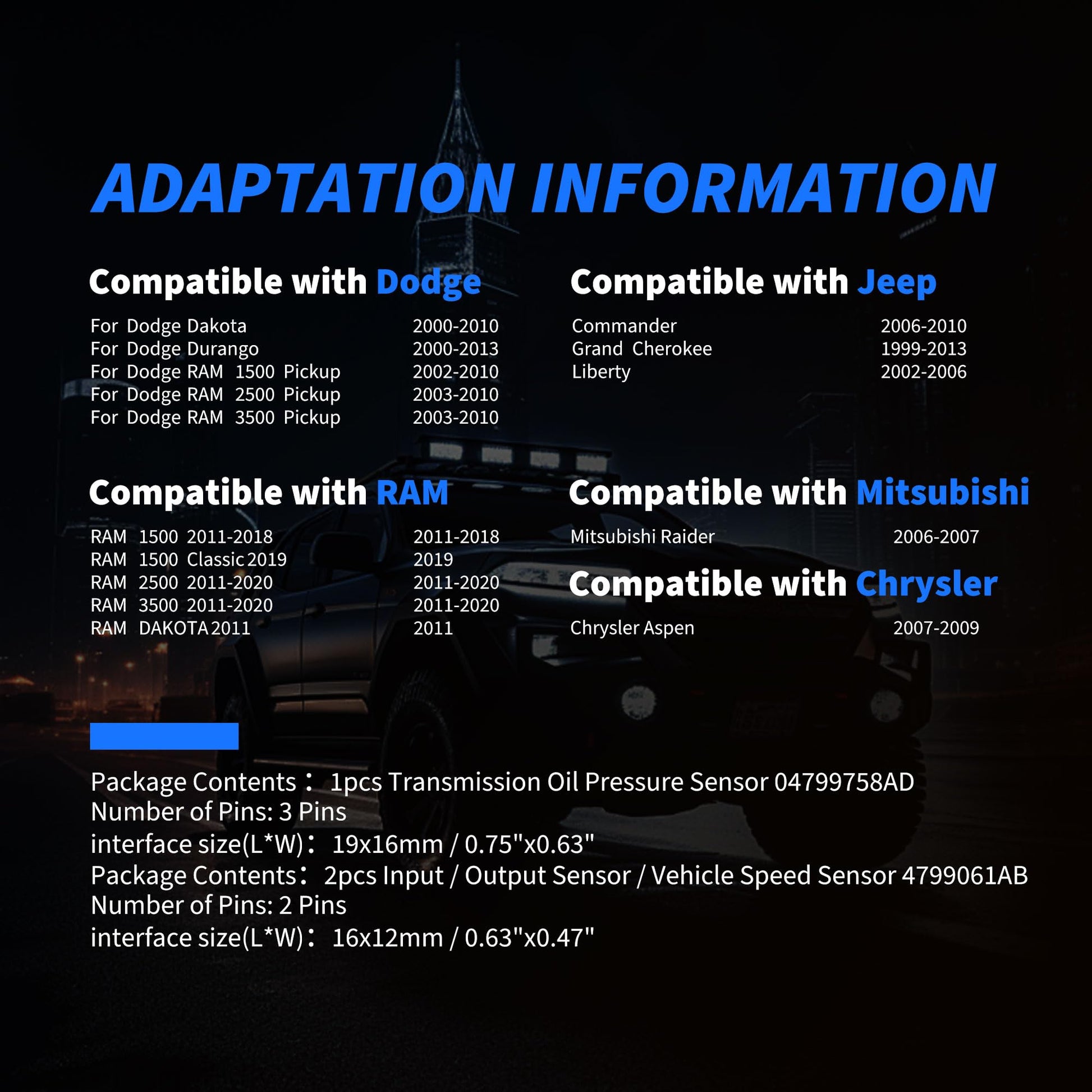 - [ Package ] - 1pcs Transmission Oil Pressure Sensor 04799758AD & 2pcs Input / Output Sensor / Vehicle Speed Sensor 4799061AB
