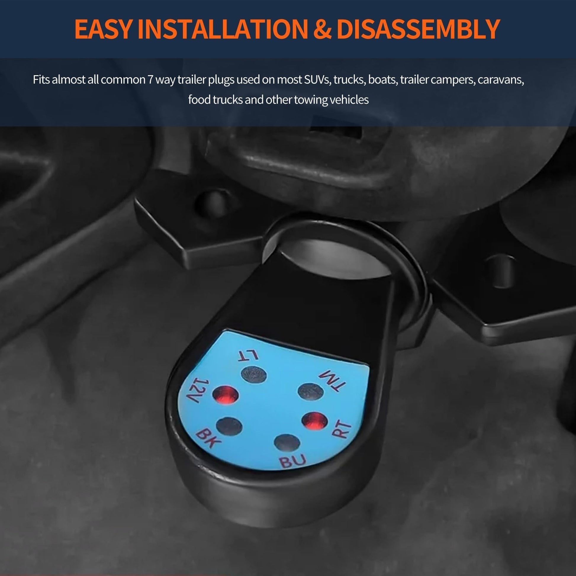 - Fitment - 7-Way Trailer Plug Tester Compatible with most vehicles,towing trailers,RVs,pushcarts,trailers,pickup trucks,off-road vehicles,sedans,yachts,ships,motorcycles,bike racks,food trucks,and other towing vehicles.