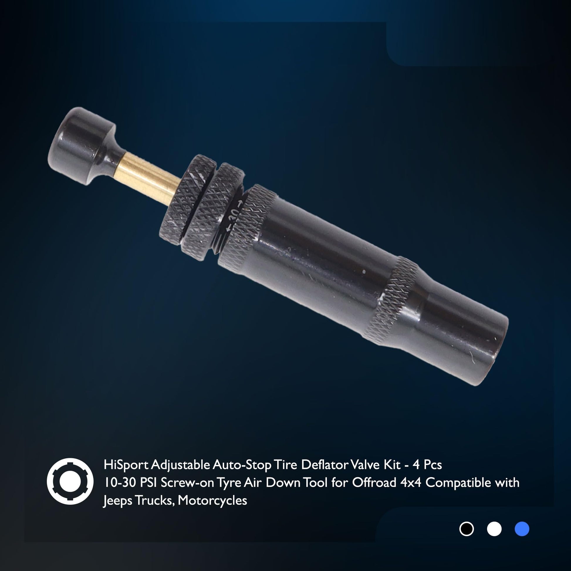 HiSport Adjustable Auto-Stop Tire Deflator Valve Kit - 4 Pcs 10-30 PSI Screw-on Tyre Air Down Tool for Offroad 4x4 Compatible with Jeeps Trucks, Motorcycles