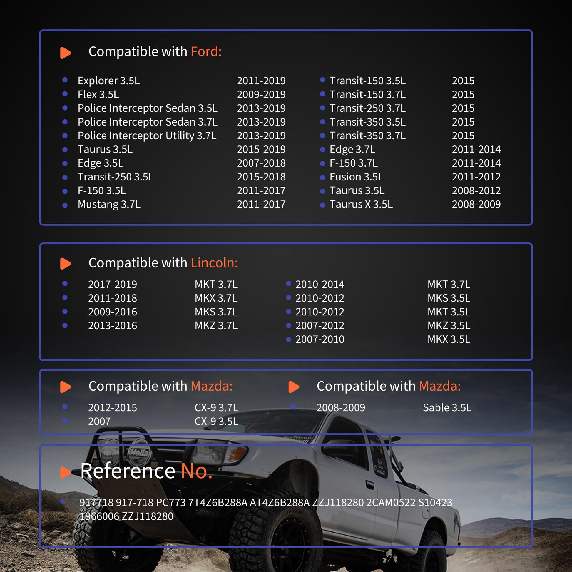 - [Applicability]The part compatible with Ford Edge 3.7L 2011-2014 F-150 3.7L 2011-2014 Fusion 3.5L 2011-2012 Taurus 3.5L 2008-2012 Taurus X 3.5L 2008-2009. Compatible with Lincoln MKT 3.7L 2017-2019 MKX 3.7L 2011-2018 MKS 3.7L 2009-2016 MKZ 3.7L 2013-2016 MKT 3.7L 2010-2014 MKS 3.5L 2010-2012 MKT 3.5L 2010-2012 MKZ 3.5L 2007-2012 MKX 3.5L 2007-2010. Compatible with Mazda CX-9 3.7L 2012-2015 CX-9 3.5L 2007. Compatible with Mercury Sable 3.5L 2008-2009