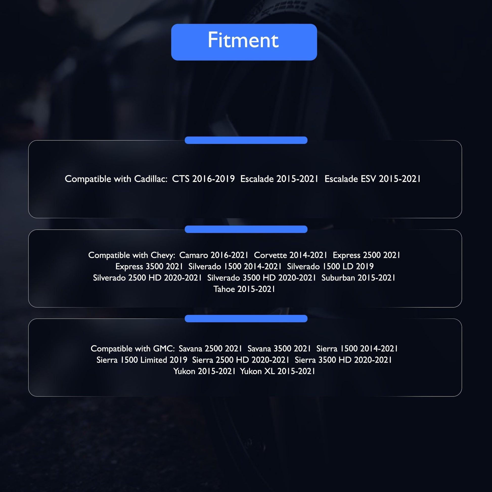 - [Applicability]The part compatible with Cadillac CTS 2016-2019 Escalade 2015-2021 Escalade ESV 2015-2021 .Compatible with Chevy Camaro 2016-2021 Corvette 2014-2021 Express 2500 2021 Express 3500 2021 Silverado 1500 2014-2021 Silverado 1500 LD 2019 Silverado 2500 HD 2020-2021 Silverado 3500 HD 2020-2021 Suburban 2015-2021 Tahoe 2015-2021