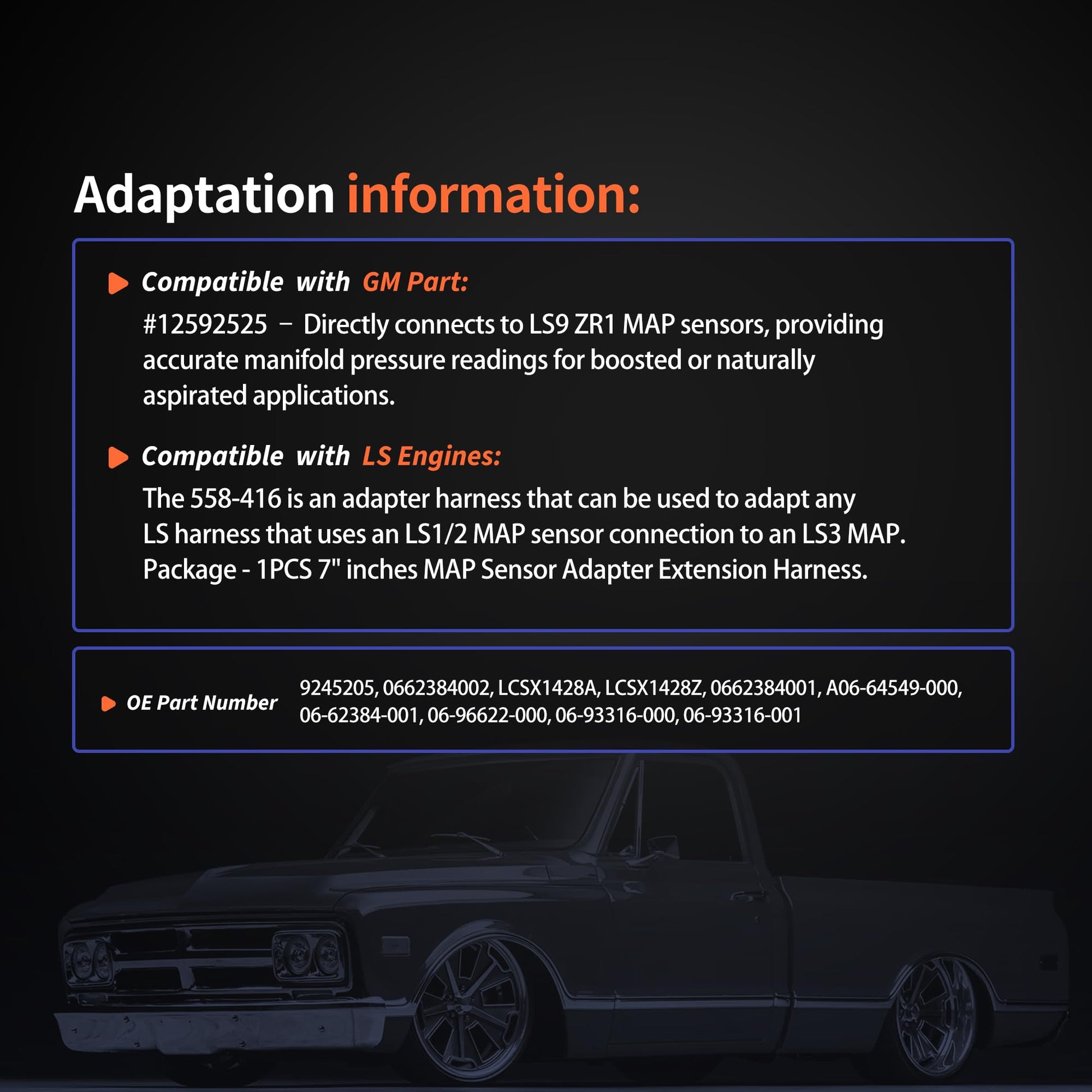 - Compatible with GM LS Engines - The 558-416 is an adapter harness that can be used to adapt any LS harness that uses an LS1/2 MAP sensor connection to an LS3 MAP.