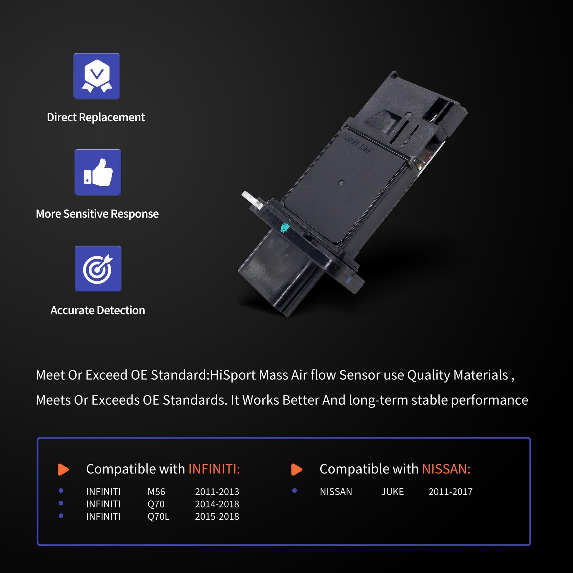 - Fitment:The mass air flow sensor is compatible with INFINITI M56 Q70 Q70L 2011-2018 NISSAN JUKE 2011-2017