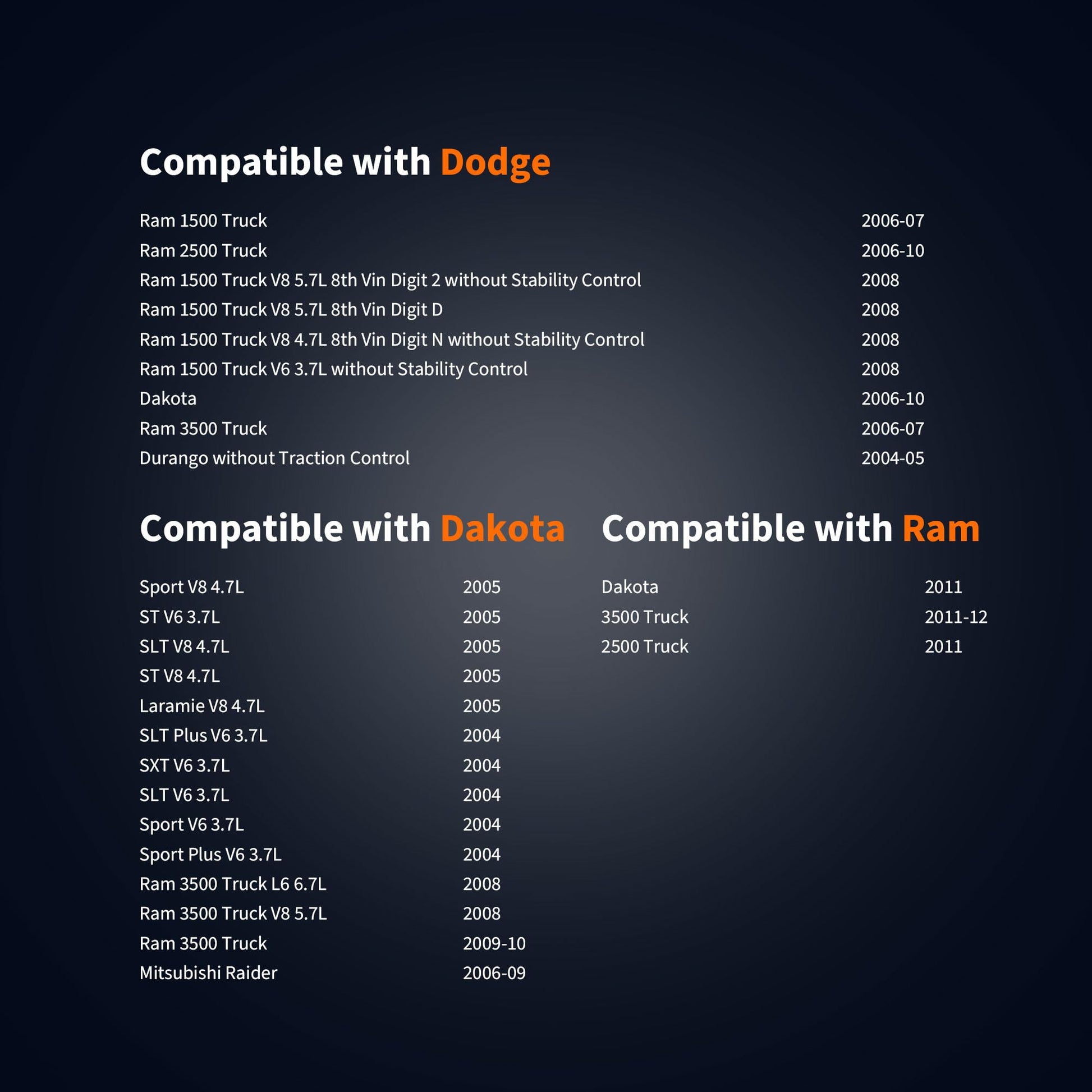 - [Fitment 2] - Compatible with Mitsubishi Raider 2006-2009 V6 3.7L, Raider 2006-2007 V8 4.7L---Rear Center; Compatible with Ram 3500 2011 L6 6.7L/V8 5.7L---Rear Center,Ram 2500 2011 L6 6.7L/V8 4.7L/V8 5.7L---Rear Left or Rear Center,Ram Dakota 2011 V6 3.7L/V8 4.7L---Rear,Ram 3500 2012 L6 6.7L/V8 5.7L---Rear