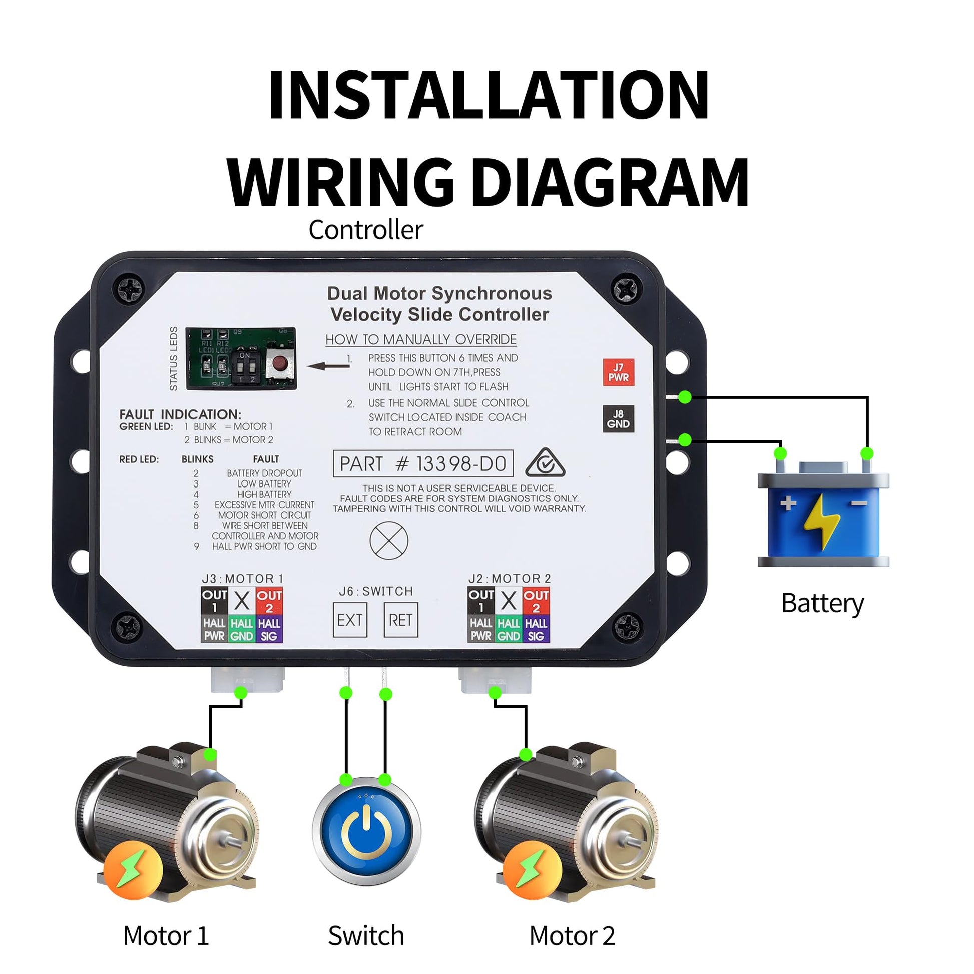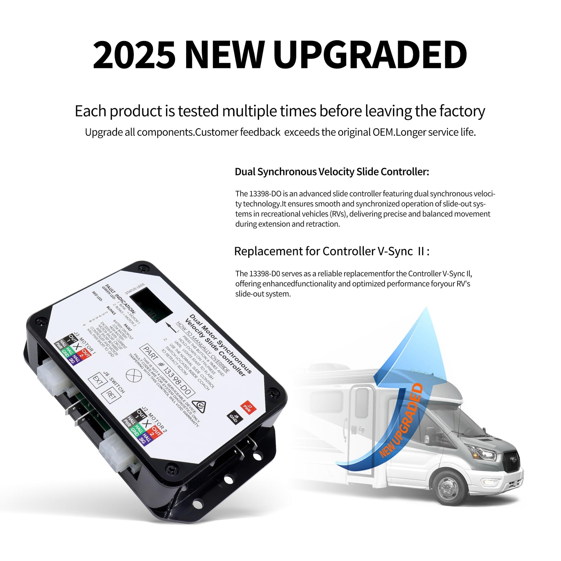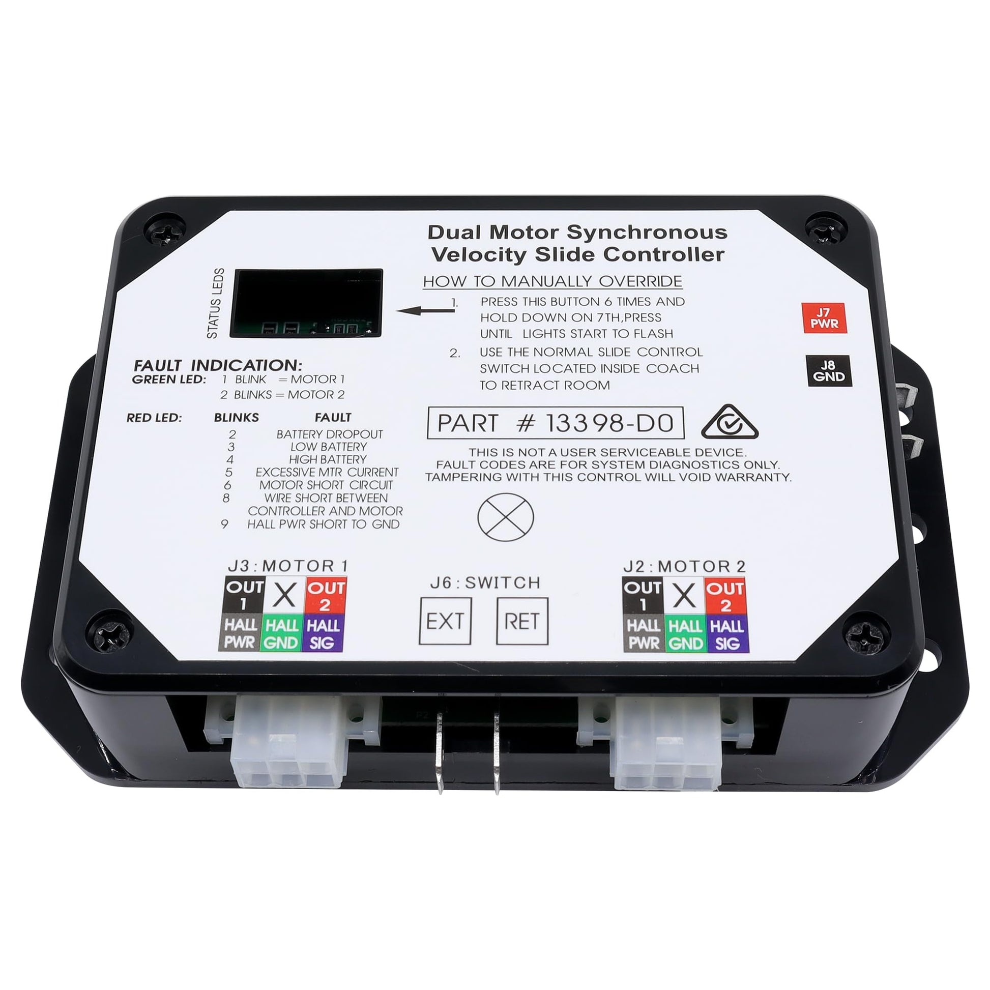 - [ Part Number & Compatibility ] : 13398-DO, 13398-C2, and 211852, Compatible with Lippert In-Wall slide-outs Controller V-Sync II. Please note: Controller version 13398-DO has replaced the 13398-C2.