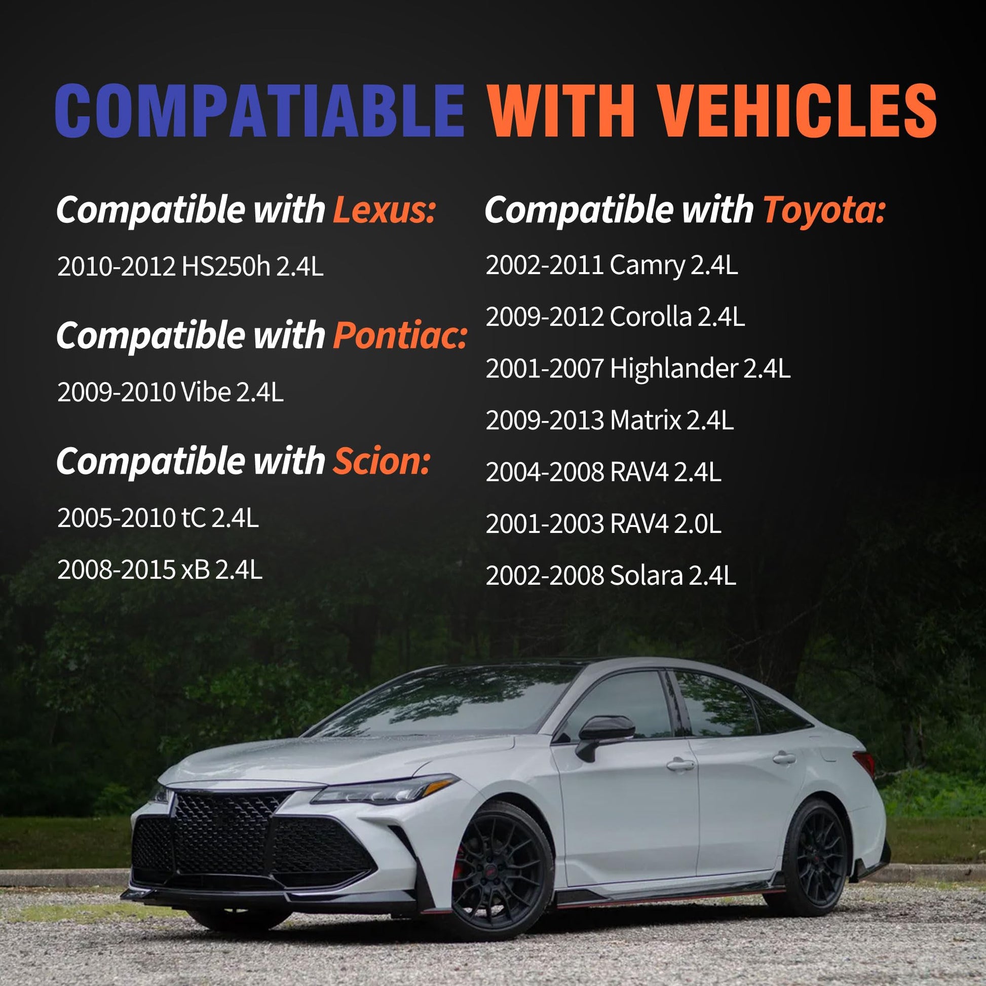 - [Applicability]The part compatible with Lexus 2010-2012 HS250h 2.4L. Compatible with Pontiac 2009-2010 Vibe 2.4L. Compatible with Scion 2005-2010 tC 2.4L 2008-2015 xB 2.4L. Compatible with Toyota 2002-2011 Camry 2.4L 2009-2012 Corolla 2.4L 2001-2007 Highlander 2.4L 2009-2013 Matrix 2.4L 2004-2008 RAV4 2.4L 2001-2003 RAV4 2.0L 2002-2008 Solara 2.4L