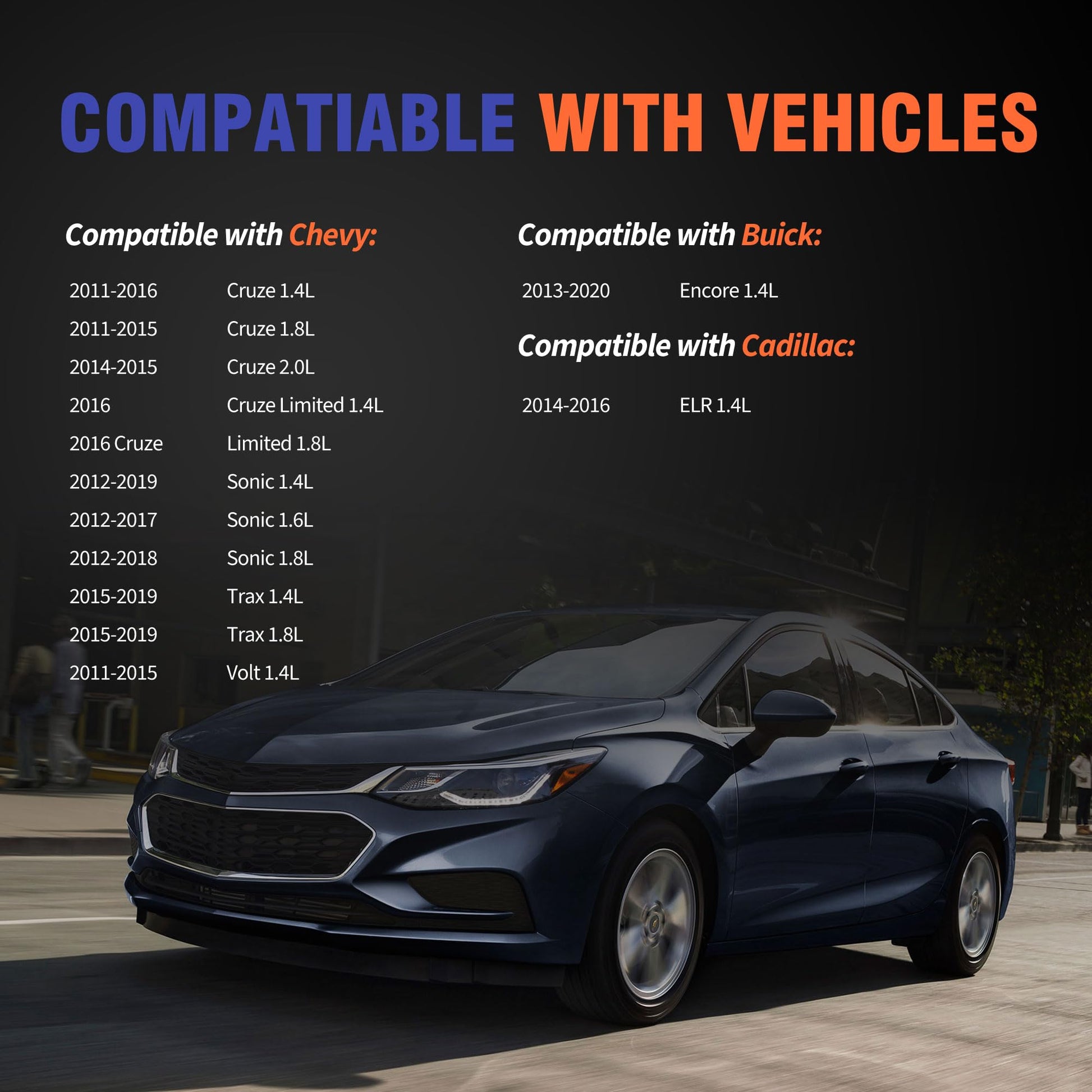 - [Applicability]The part compatible with Buick 2013-2020 Encore 1.4L. Compatible with Cadillac 2014-2016 ELR 1.4L. Compatible with Chevy 2011-2016 Cruze 1.4L 2011-2015 Cruze 1.8L 2014-2015 Cruze 2.0L 2016 Cruze Limited 1.4L 2016 Cruze Limited 1.8L 2012-2019 Sonic 1.4L 2012-2017 Sonic 1.6L 2012-2018 Sonic 1.8L 2015-2019 Trax 1.4L 2015-2019 Trax 1.8L 2011-2015 Volt 1.4L