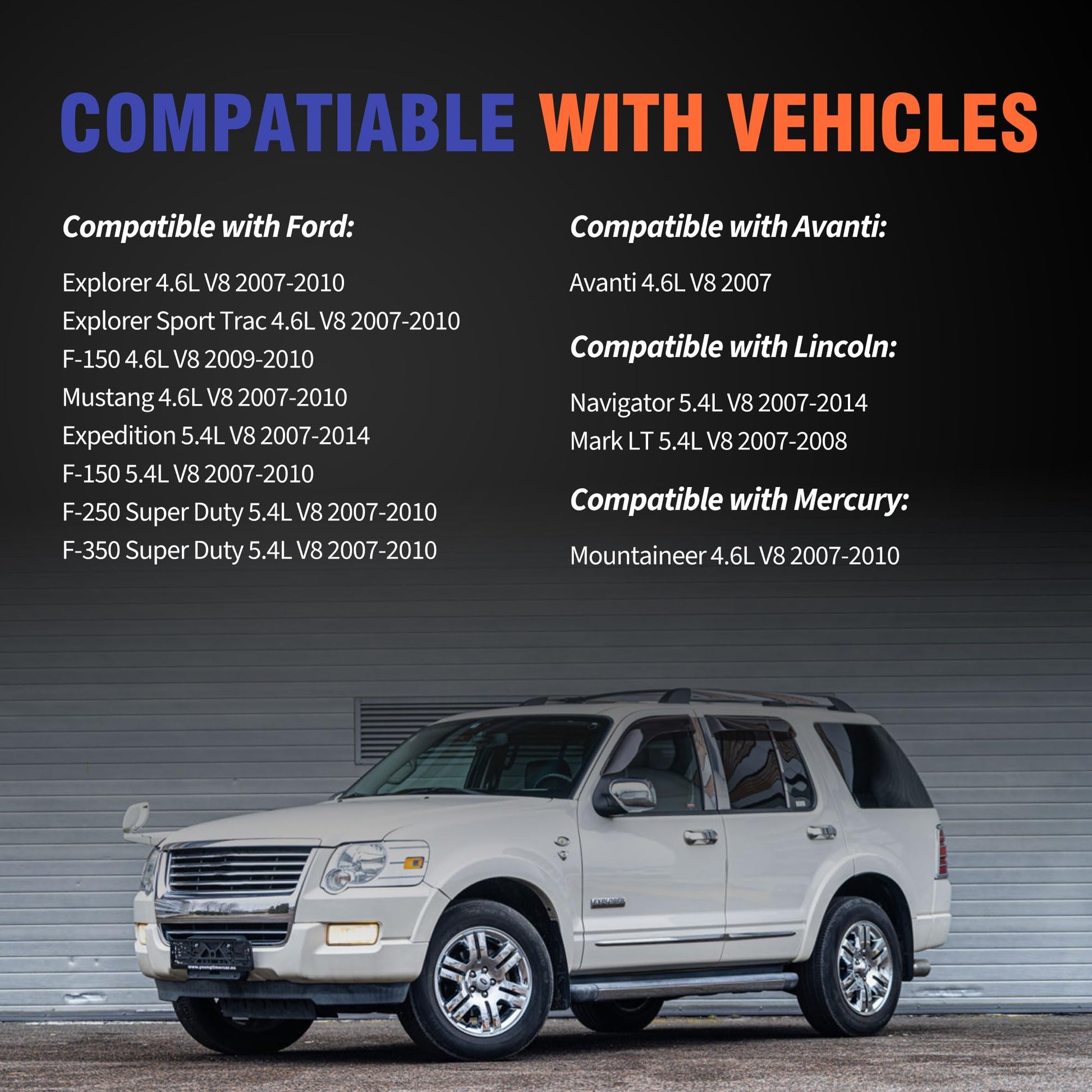- [Applicability]The part compatible with Avanti Avanti 4.6L V8 2007 .Compatible with Ford Explorer 4.6L V8 2007-2010 Explorer Sport Trac 4.6L V8 2007-2010 F-150 4.6L V8 2009-2010 Mustang 4.6L V8 2007-2010 Expedition 5.4L V8 2007-2014 F-150 5.4L V8 2007-2010 F-250 Super Duty 5.4L V8 2007-2010 F-350 Super Duty 5.4L V8 2007-2010 .Compatible with Lincoln Navigator 5.4L V8 2007-2014 Mark LT 5.4L V8 2007-2008 .Compatible with Mercury Mountaineer 4.6L V8 2007-2010